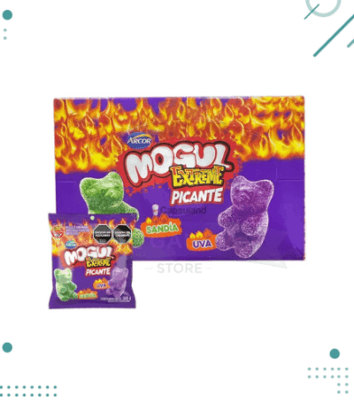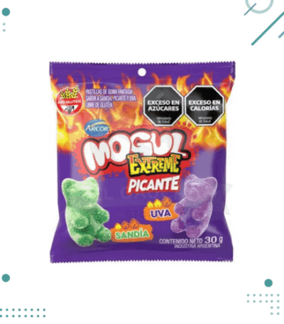 Explosión de sabor con los Ositos Mogul Extreme Picantes en sabores sandía y uva. Estas gomitas, con un peso neto