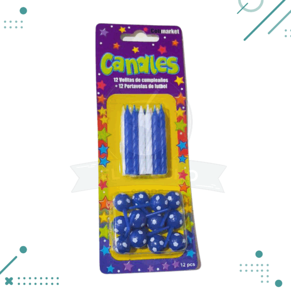 12 Velas de cumpleaños azul y blanco con 12 portavelas pelota futbol