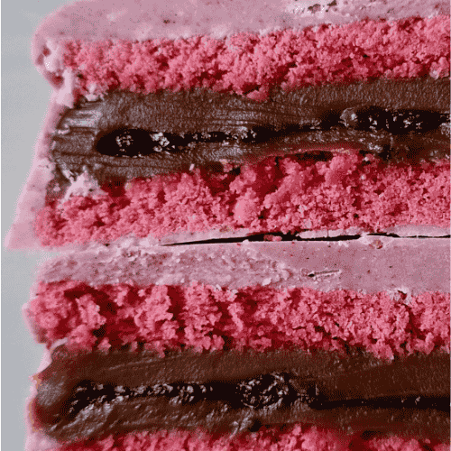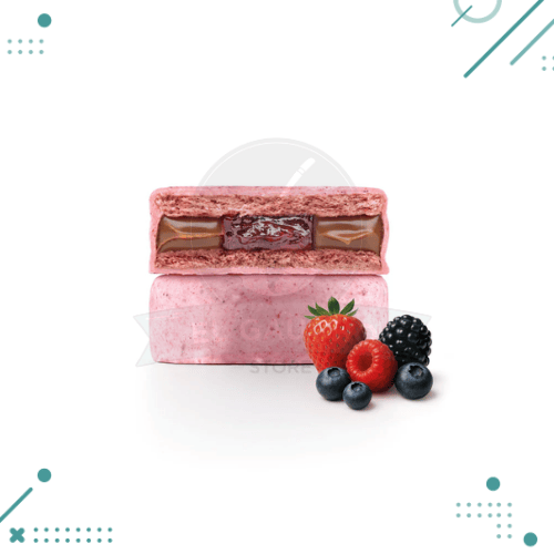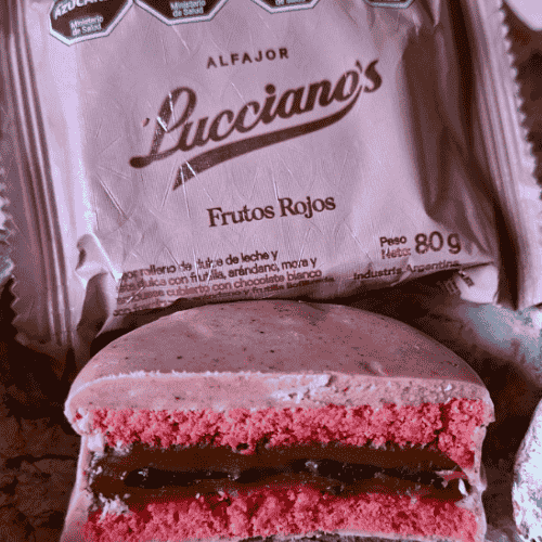 Cada alfajor está relleno con dulce de leche cremoso y un corazón de frutos rojos (frutilla, arándano, mora y frambuesa), y recubierto con chocolate blanco belga saborizado con frutas liofilizadas.