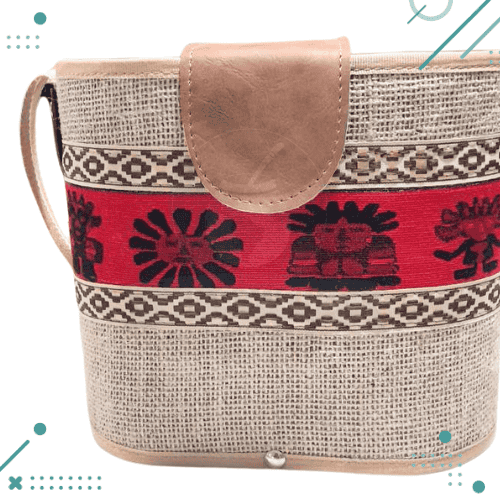 BOLSO MEDIA CANASTA ARPILLERA CON GUARDA Y DISEÑOS SIMBOLICOS COLOR BEIGE