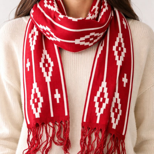 Bufanda de hilo reversible en color rojo intenso, ideal para sumar abrigo y estilo a cualquier look. Su diseño tradicional con guardas geométricas le aporta un carácter auténtico y versátil, perfecto tanto para uso diario como para ocasiones especiales.