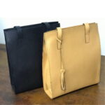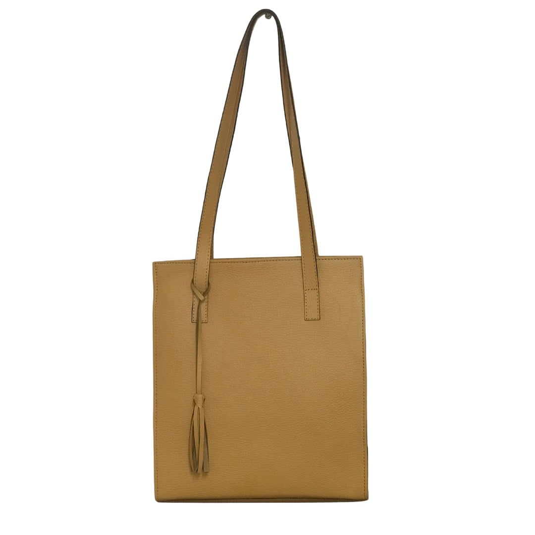 Manijas de cuero largas para colgar en el hombro. En la parte superior, posee cierre y en su amplio interior un bolsillo con cierre. Medidas aproximadas: 32x28x10