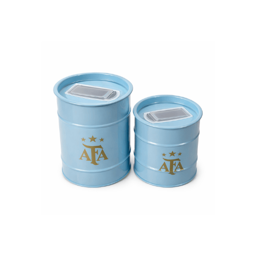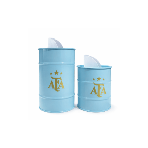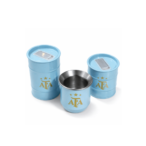 El combo incluye yerbera/azucarera estilo lata y mate térmico AFA, ambos en color celeste con el emblemático logo dorado de la Asociación del Fútbol Argentino y sus estrellas. Un conjunto ideal para acompañarte todos los días, en casa, en la oficina o donde vayas.