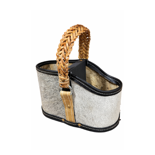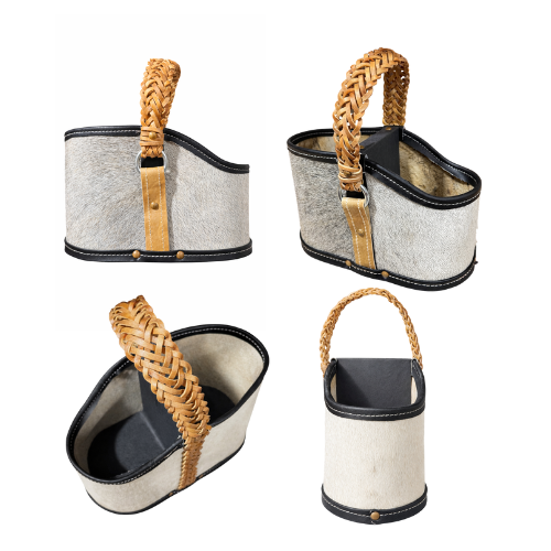 Confeccionada en pelo vacuno natural, cada canasta presenta vetas y matices propios, lo que la convierte en un producto exclusivo e irrepetible. Sus refuerzos en cuero legítimo color suela, costuras visibles y herrajes metálicos garantizan resistencia y durabilidad, mientras que la manija trenzada a mano aporta un detalle distintivo y sofisticado.