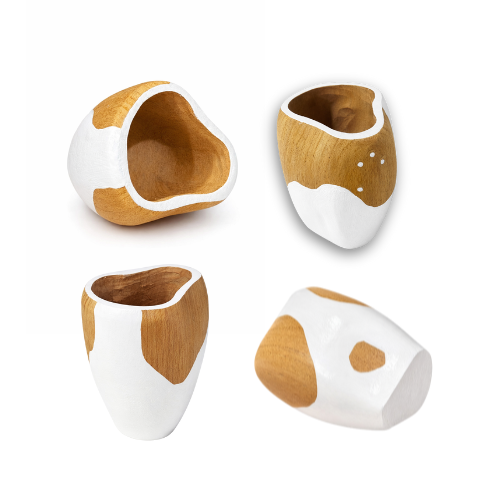 Mate artesanal de estilo ranchero, elaborado en madera natural y pintado a mano, lo que hace que cada pieza sea única. Su diseño orgánico con manchas blancas resalta la veta de la madera, combinando tradición y estética contemporánea.