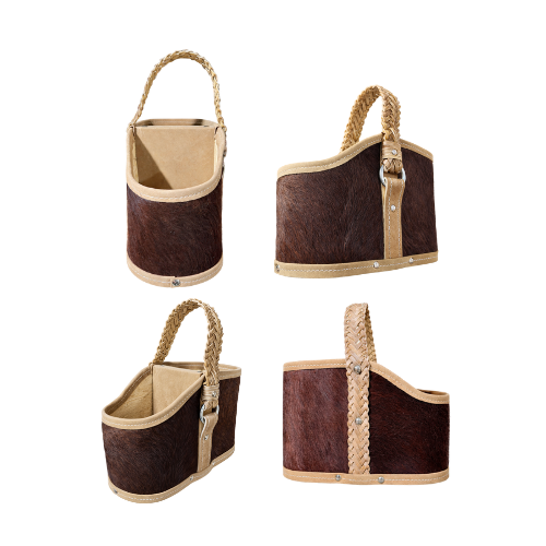 La Media Canasta Premium de Pelo Vacuno combina diseño rústico y elegancia artesanal, ideal para aportar carácter y calidez a cualquier espacio. Confeccionada en pelo vacuno natural color marrón, cada pieza es única, destacándose por sus vetas y texturas propias del cuero auténtico.