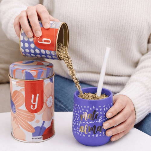 Combo Matero – Yerbera/Azucarera Lata Flores (rojo y violeta) + Mate Nordico Violeta (mate para el alma)+ Bombilla