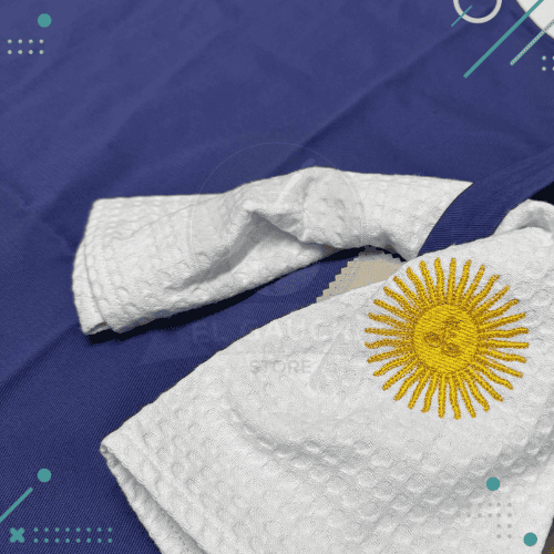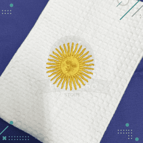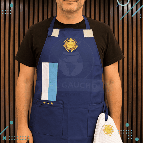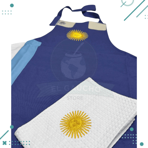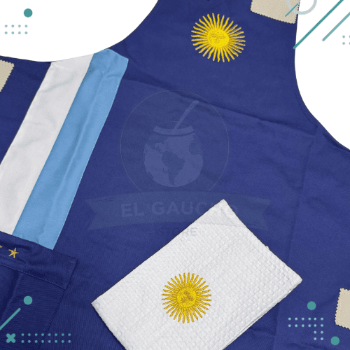 Con el Sol de Mayo bordado + las tres estrellas en el bolsillo, con apliques en cuero blanco, tiras y lazos en mismo color, un bolsillo frontal y porta repasador