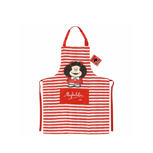 Cocinar también puede ser divertido. Este delantal de Mafalda es el aliado perfecto para sumar color, humor y personalidad a tu cocina. Con un diseño icónico del querido personaje de Quino y un patrón de rayas rojas, es ideal tanto para el uso diario como para regalar a fans de Mafalda de todas las edades.