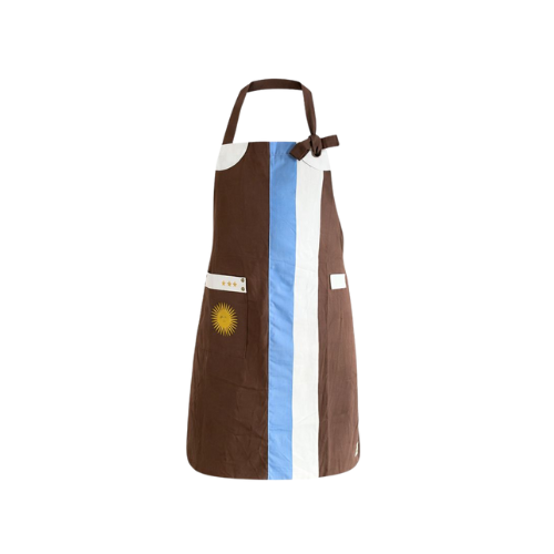 Este delantal parrillero marrón, inspirado en los colores de la bandera argentina, es ideal para quienes disfrutan de la parrilla con pasión y quieren lucir un look auténtico y prolijo.