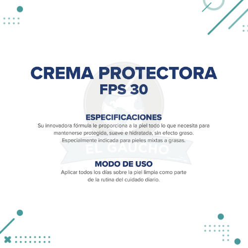 FPS 30; Factor de protección solar 30 que protege la piel contra los daños producidos por los rayos UVA y UVB.