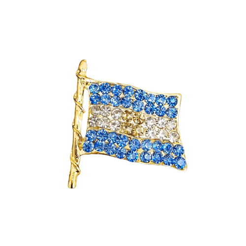 Proponemos un producto de aspecto elegante e impactante, pero prudente a la vez, ideal para representar los colores nacionales con distinción. Este pin prendedor con diseño de la Bandera Argentina está confeccionado en metal color dorado y engarzado con cristal austríaco de excelente calidad, que aporta brillo y sofisticación sin exceso.