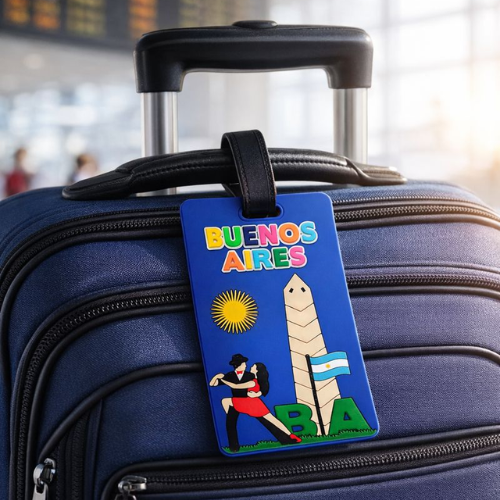 Dale un toque único a tu equipaje con este tag identificador de silicona inspirado en Buenos Aires, con diseño del icónico Obelisco, tango y colores representativos de Argentina. Ideal para valijas, mochilas, bolsos y carry on, perfecto para viajeros frecuentes.