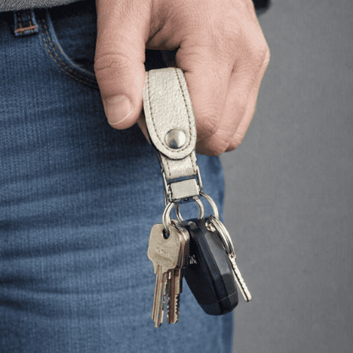Su diseño en color blanco aporta un estilo elegante y moderno, ideal para quienes buscan un complemento diferente y sofisticado. Las costuras reforzadas garantizan firmeza y larga vida útil, mientras que el herraje metálico resistente asegura un agarre seguro para tus llaves.