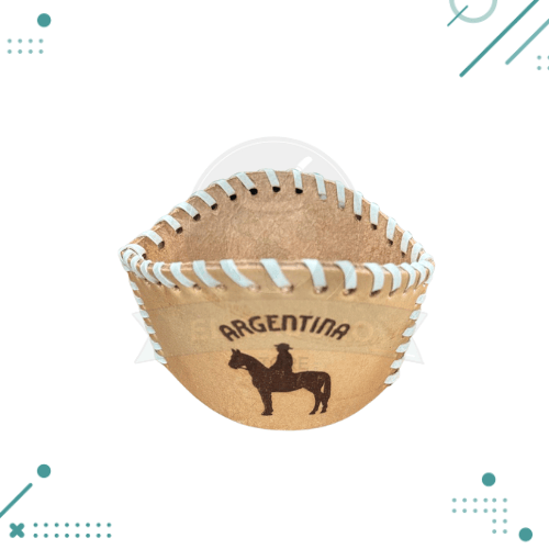 Un clásico argentino que combina tradición y estilo. Este mate está elaborado con calabaza natural curada, revestida en su base con cuero vaqueta genuino, cosido artesanalmente con tiento. Su diseño destaca por el grabado del gaucho a caballo y la palabra Argentina, símbolo de identidad y orgullo nacional.