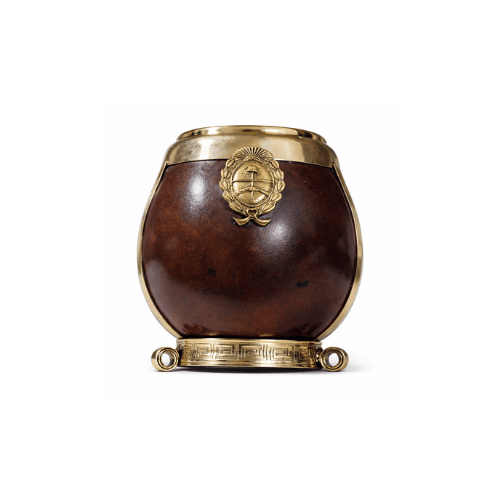 Mate artesanal de calabaza natural, seleccionado por su forma y excelente terminación. Presenta un elegante dije frontal en alpaca con el diseño del Escudo Nacional Argentino, que aporta identidad, tradición y distinción a la pieza.