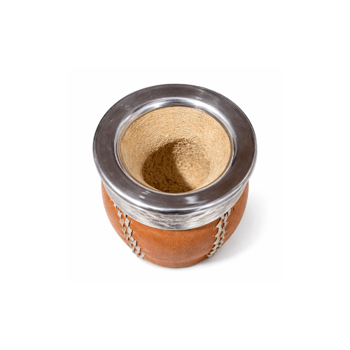 La calabaza, material tradicional por excelencia, aporta una experiencia de sabor única y mejora con el uso. Su forrado en cuero vacuno color suela brinda mayor resistencia, mejor agarre y una estética rústica y elegante. Las costuras artesanales realzan el diseño y destacan el trabajo manual en cada pieza.