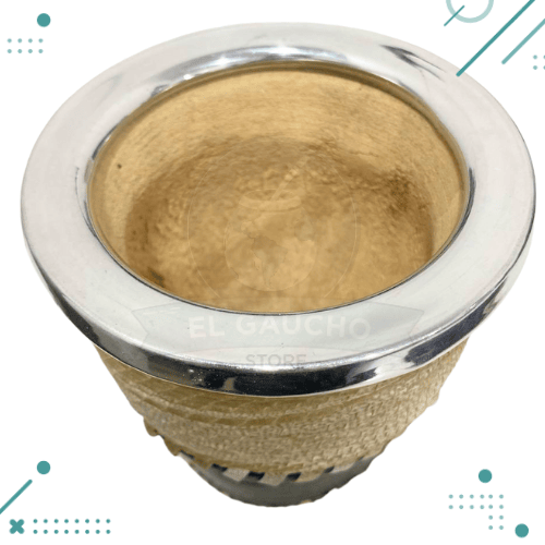 Mate de lienzo de potro tejido sobre calabaza porongo. Base de cuero vaqueta incorporada.