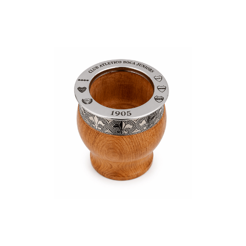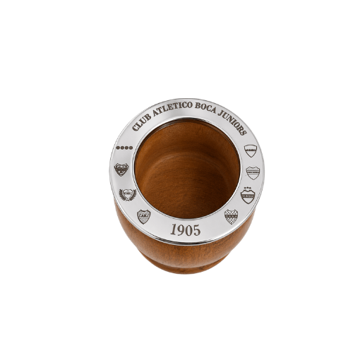 Mate imperial artesanal elaborado en madera de algarrobo seleccionada, destacada por su resistencia y vetas naturales únicas. Presenta una elegante guarda de alpaca finamente grabada con detalles alusivos a Boca Juniors, incluyendo el nombre del club y el año 1905, junto a escudos icónicos.