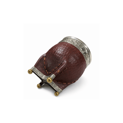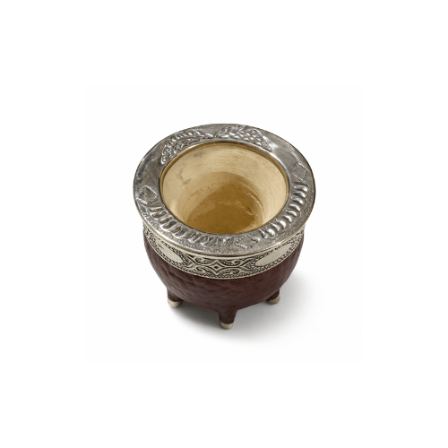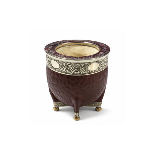 Elegancia y tradición se unen en este mate imperial artesanal, confeccionado en cuero legítimo trabajado a mano y detalles metálicos de primera calidad. Su virola de alpaca cincelada con diseño griego aporta un toque distinguido y único, mientras que las patas con terminaciones en bronce realzan su presencia.