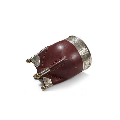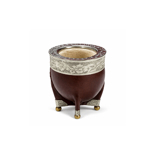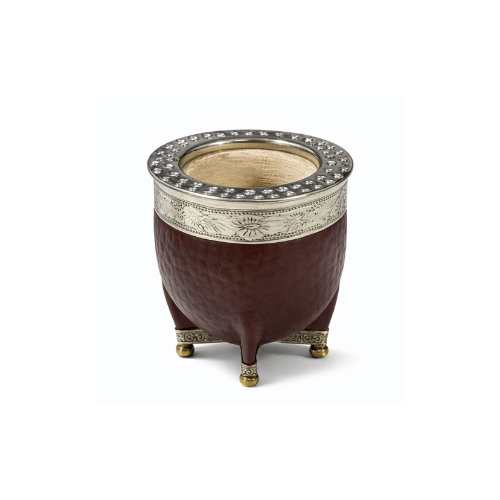 Elegancia, tradición y trabajo artesanal se combinan en este Mate Imperial de diseño distinguido. Elaborado en calabaza natural y forrado en cuero color marrón, se destaca por sus finos detalles en alpaca cincelada que realzan su presencia y calidad.