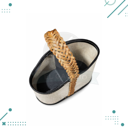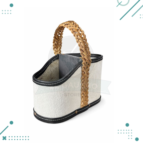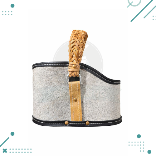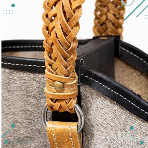 Confeccionada en pelo vacuno natural, cada canasta presenta vetas y matices propios, lo que la convierte en un producto exclusivo e irrepetible. Sus refuerzos en cuero legítimo color suela, costuras visibles y herrajes metálicos garantizan resistencia y durabilidad, mientras que la manija trenzada a mano aporta un detalle distintivo y sofisticado.