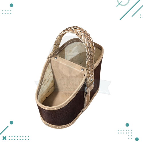 La Media Canasta Premium de Pelo Vacuno combina diseño rústico y elegancia artesanal, ideal para aportar carácter y calidez a cualquier espacio. Confeccionada en pelo vacuno natural color marrón, cada pieza es única, destacándose por sus vetas y texturas propias del cuero auténtico.