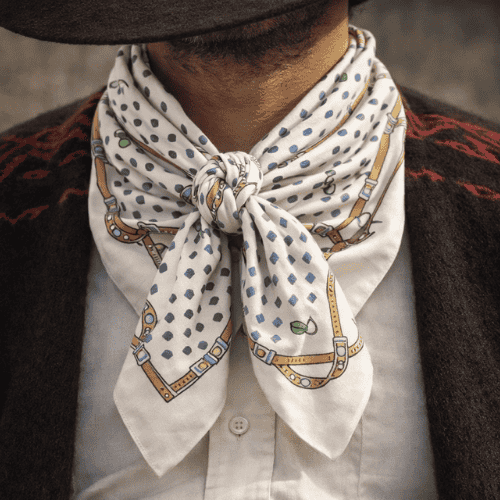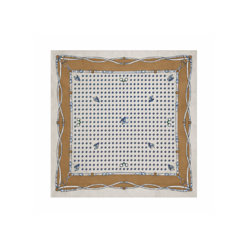 Este pañuelo Fratello combina elegancia clásica y estilo ecuestre en un diseño sofisticado y atemporal. Presenta un delicado estampado de caballos y herrajes sobre fondo beige, acompañado por detalles en tonos marrón y azul que realzan su carácter distintivo y refinado.