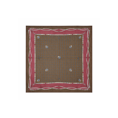 Este pañuelo Fratello destaca por su elegancia clásica y su inspiración ecuestre. Presenta un sofisticado diseño de caballos y herrajes, combinado con un patrón geométrico sutil en tonos marrón, con detalles en rosado y azul que aportan contraste y carácter al conjunto.