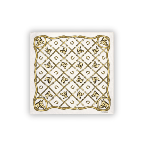 Sumá un toque de elegancia clásica a tu look con el pañuelo Fratello de diseño ecuestre. Confeccionado en tela suave y liviana, este pañuelo presenta un sofisticado estampado de caballos, herraduras y detalles de inspiración hípica en tonos beige y dorado sobre fondo claro, ideal para realzar cualquier outfit.