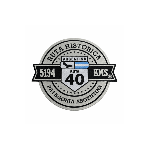 Con diseño circular estilo insignia, combina detalles bordados en tonos negro, gris y celeste, destacando la referencia a los 5194 km que recorren la Patagonia Argentina. Ideal para amantes del road trip, la montaña y la cultura viajera.