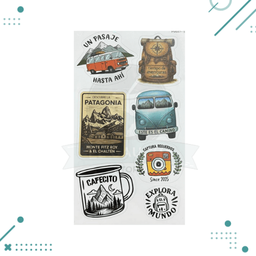 Cada plancha incluye una selección de stickers inspirados en la naturaleza, los paisajes del sur argentino y el amor por los viajes. Con diseños únicos de montañas, combis, mochilas y frases viajeras, son perfectos para decorar tus objetos favoritos y recordar que siempre hay un nuevo destino por descubrir.