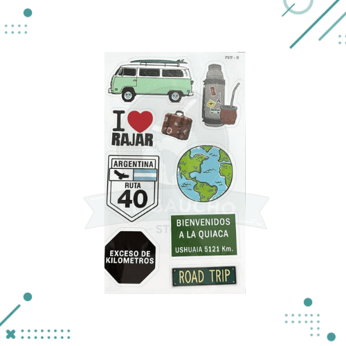 Esta plancha incluye 9 stickers con diseños inspirados en los viajes, la libertad y la cultura argentina. Encontrá íconos como la mítica Ruta 40, la combi viajera, el mate, y frases clásicas como “Exceso de kilómetros” o “I ❤️ rajar”. Perfectos para personalizar tu valija, termo, libreta o cualquier objeto que te acompañe en tus escapadas.
