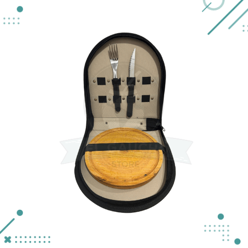 Porta Set Asado Cuero Color Verde (Plato de Madera, Tenedor, Cuchillo)