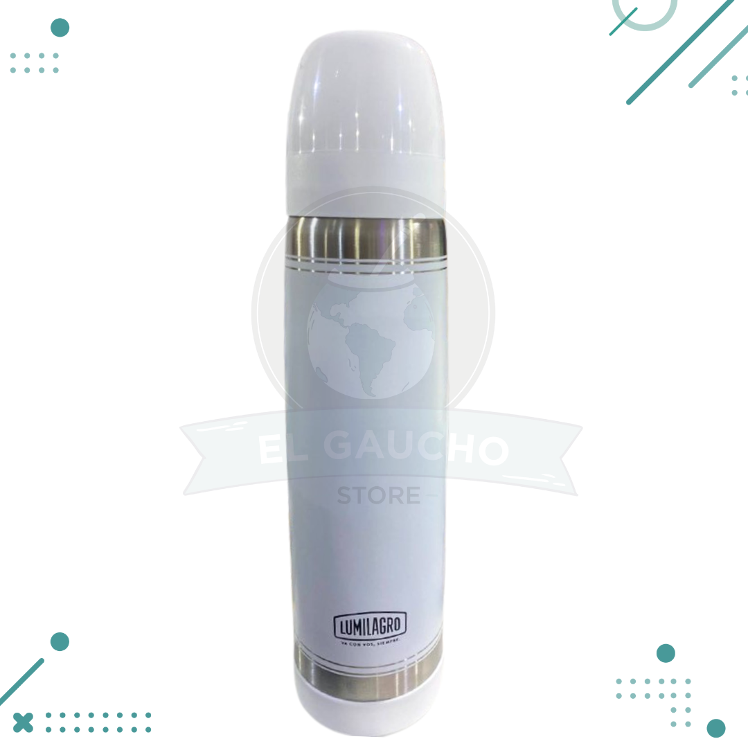 Termo de un 1 lt. de acero inoxidable y pico vertedor con tapa de plástico.