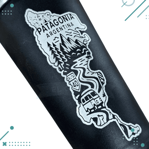 Este vaso de aluminio de 1 litro combina resistencia, diseño y espíritu viajero. Su acabado negro mate con grabado de alta definición muestra un mapa artístico de Argentina, destacando la mítica Ruta 40, montañas, lagos y elementos icónicos de la región patagónica.