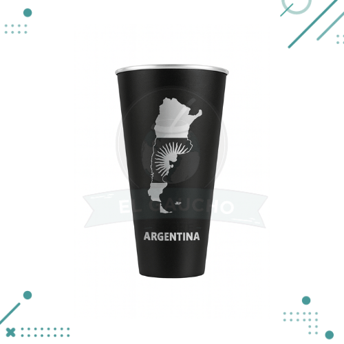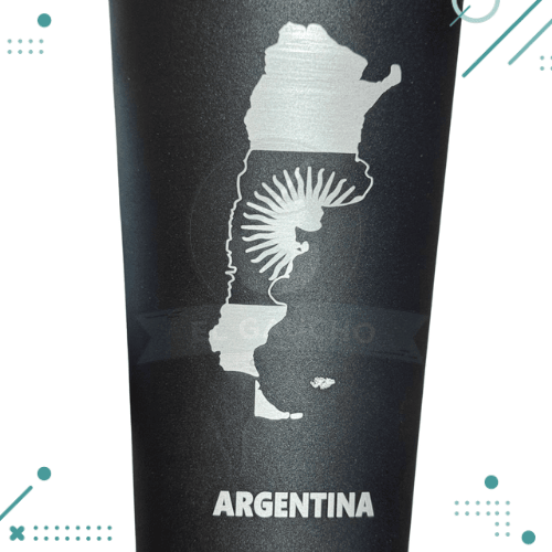 Elegante vaso de acero inoxidable en color negro mate, con diseño grabado del mapa de Argentina y el Sol de Mayo, símbolo nacional. Su acabado premium lo convierte en una pieza única para quienes desean llevar siempre presente su identidad argentina.
